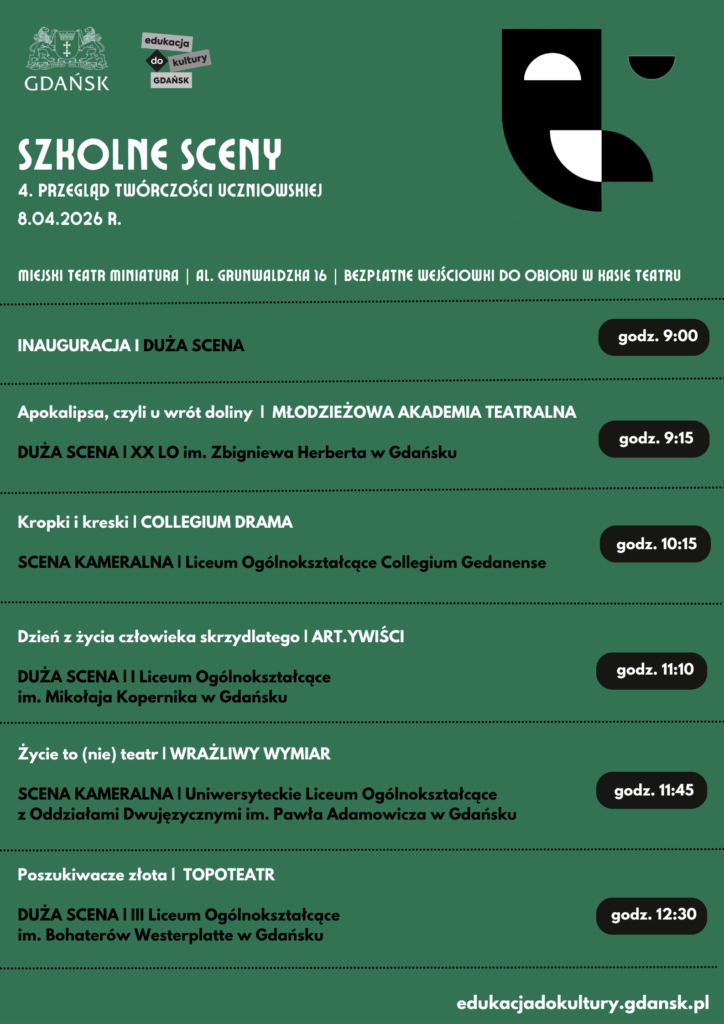Już 8 kwietnia zapraszamy na 4. Przegląd Twórczości Uczniowskiej SZKOLNE SCENY, który odbędzie się w Miejskim Teatrze Miniatura. To wyjątkowe święto gdańskiej młodzieży, podczas którego profesjonalne sceny stają się przestrzenią dla artystycznych poszukiwań uczniów i uczennic szkół ponadpodstawowych. Organizatorem wydarzenia jest Miasto Gdańsk oraz biuro programu EDUKACJA DO KULTURY. GDAŃSK.